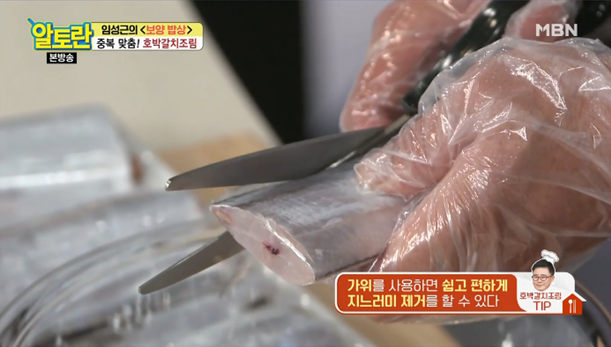 1. 먼저 갈치를 손질해야 하는데요, 갈치 손질의 핵심은 비린내를 잡는 것이죠. 딱 세가지만 기억하면 비린내와 식감을 둘 다 잡을 수 있다고 합니다. 첫 번째는 바로 지느러미를 제거하는 것인데 가위를 사용하면 쉽고 편하게 지느러미를 제거할 수 있습니다.