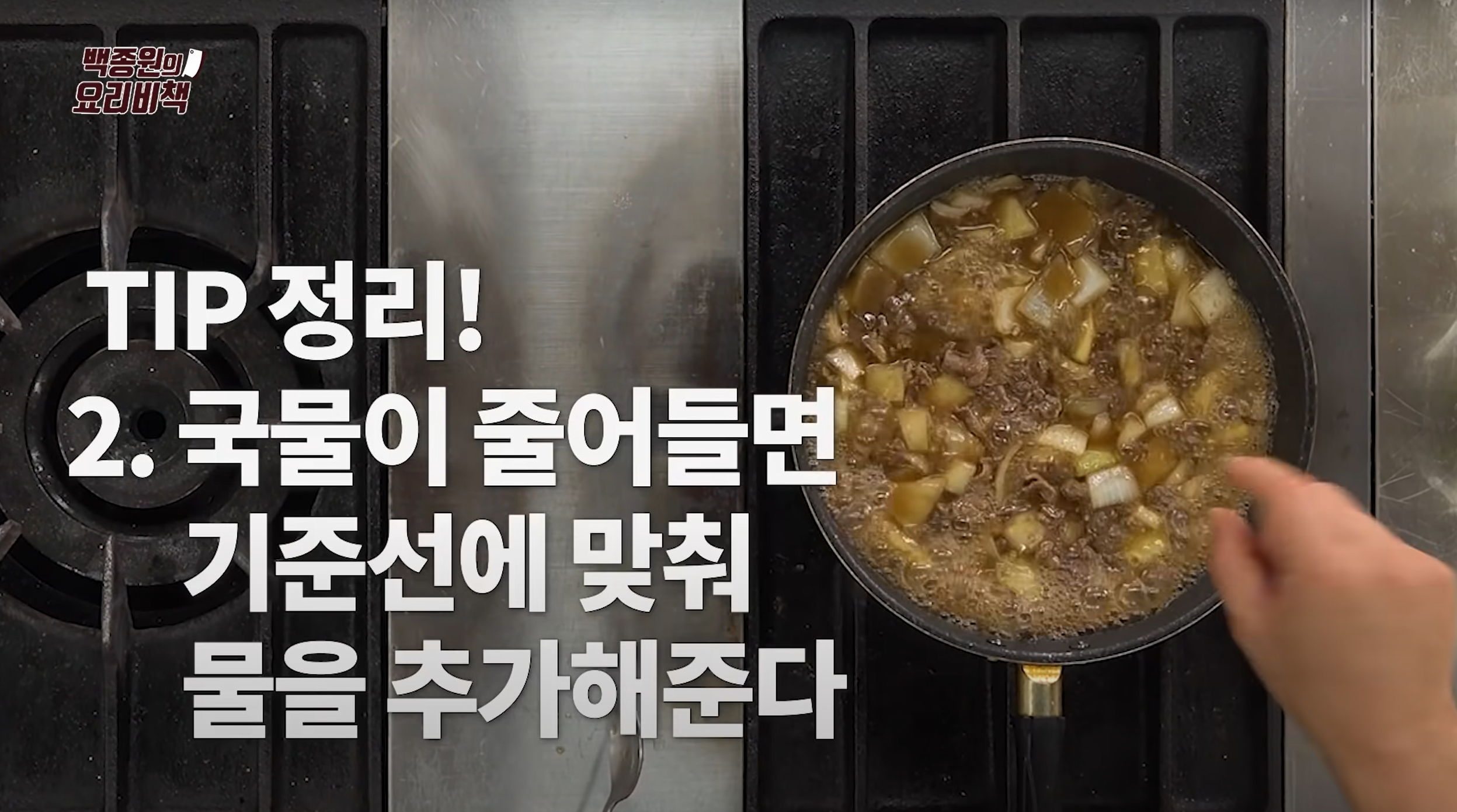 감자조림은 의외로 오랜 시간 끓일 필요가 없다고 하는데요, 이때쯤이면 이미 고기와 단맛이 배어 있다고 합니다. 여기에 진간장을 넣으면 살짝 슴슴한 감자국 같은 맛이 난다고 하는데요, 이정도만 되어도 간은 충분하다고 하네요.