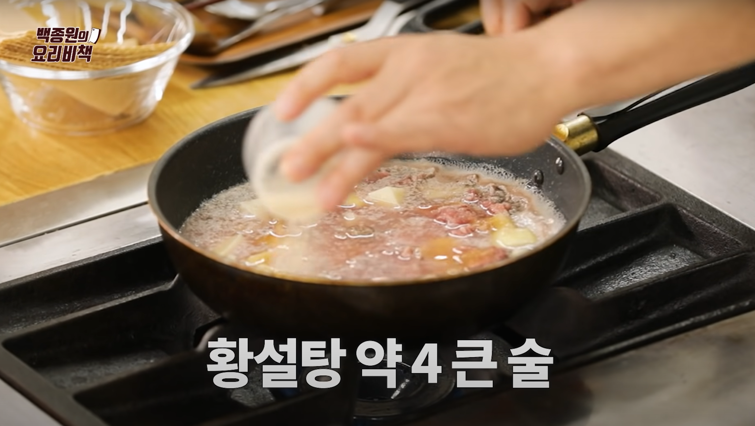 4. 깊은 프라이팬이나 냄비에 감자, 소고기, 물, 황설탕, 물엿을 넣고 강불에 올립니다.