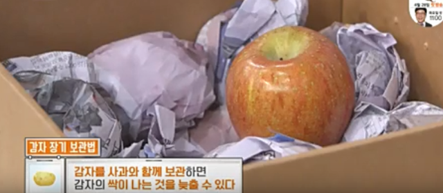 4. 여기서 감자 보관법 꿀팁 한가지! 바로 사과를 함께 넣는 건데요, 감자 사이에 사과를 넣어 같이 보관하면 사과에 있는 식물 호르몬인 에틸렌 가스가 감자의 싹이 발아하는 것을 억제하여 싹이 덜 나게 하기 때문이예요.
