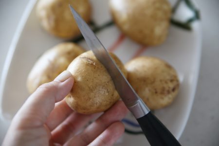 자잘한 감자를 준비해 껍질째 통째로 삶는것인데요, 이때 미리 칼로 감자를 한바퀴 돌려가며 껍질에 실금을 내는 것이예요.