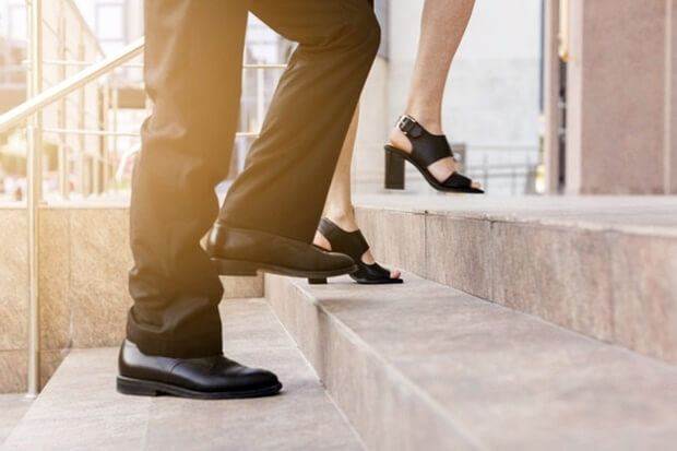 - 계단을 오를 때에는 발 전체를 딛고 터벅터벅 올라가는 것은 무릎관절의 손상으로 이어질 수 있기 때문에 발 모양을 11자 형태로 하고 발을 디딜 때 발바닥의 절반 정도만 올립니다.