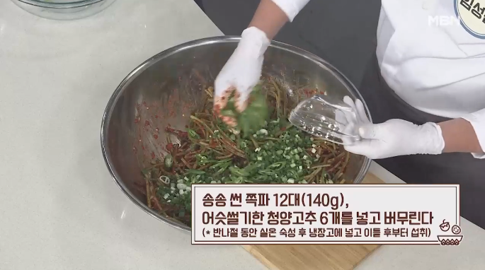 9. 다음으로 송송 썬 쪽파 12대와 어슷썰기한 청양고추 6개를 넣은 뒤 다 같이 버무립니다.
