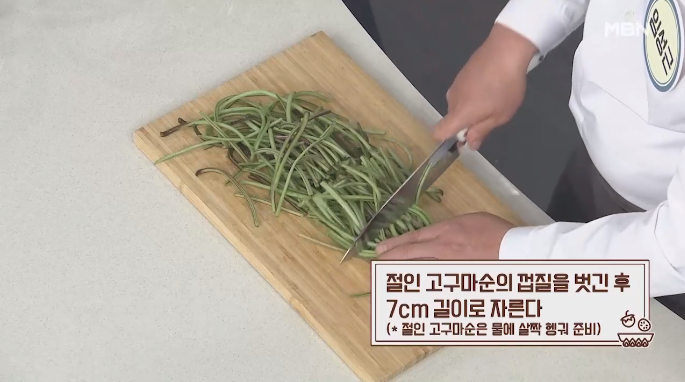 3. 절인 고구마줄기는 물에 살짝 헹궈 준비해 주시구요, 이후 껍질을 벗긴 후 7cm 길이로 잘라 주세요.