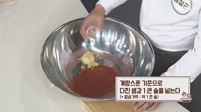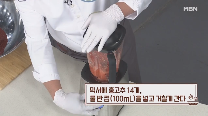 양념재료 : 고춧가루 10큰술, 다진마늘 4큰술, 다진생강 1큰술, 멸치액젓 12큰술, 매실청 20큰술, 홍고추 14개, 물 반컵 (100mL), 소금 1큰술