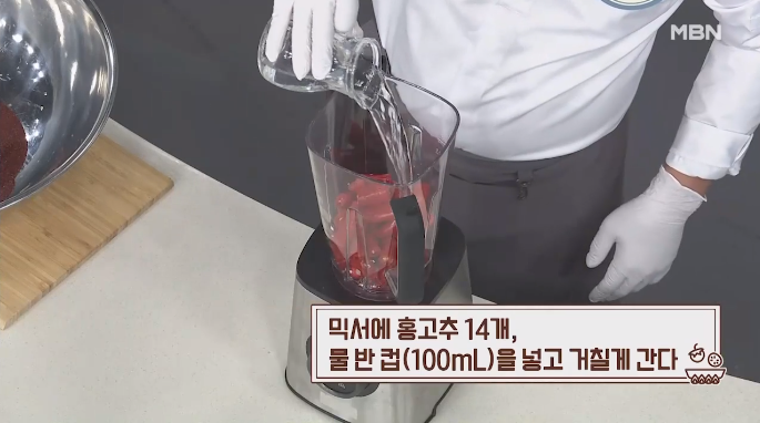 5. 믹서에 홍고추 14개와 물 반컵을 넣고 갈아 주세요. 가실 땐 너무 곱게 갈지 말고 거칠게 갈아주시는 것이 좋다고 하네요.