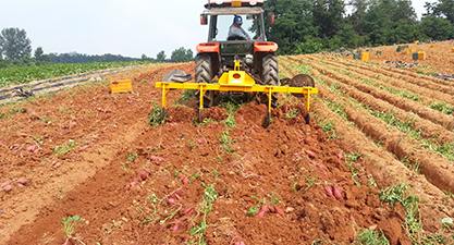 고구마는 텃밭 등 소면적일 때는 호미나 쇠스랑을 이용하여 인력으로 수확하지만 대면적일 때는 경운기 또는 트랙터에 굴취기를 부착하여 수확합니다. 토양조건에 따라 쟁기형이나 체인형(사질토) 등을 선택하여 수확하면 됩니다.