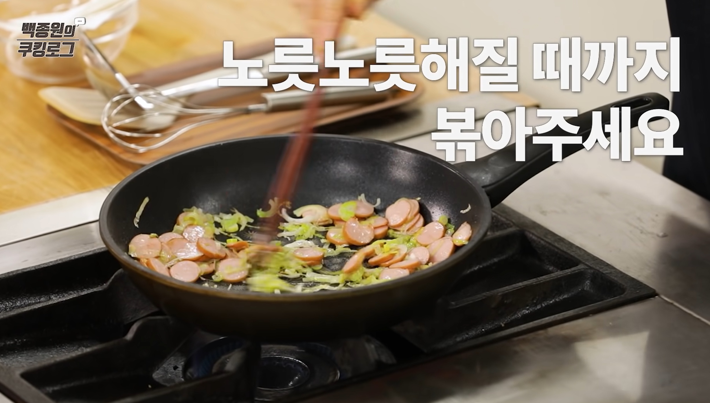 3. 팬에 식용유를 두르고 대파, 소시지를 넣어 노릇하게 볶습니다. 소시지는 집에 있는 햄이나 소시지, 베이컨 등 아무거나 사용하셔도 좋아요.