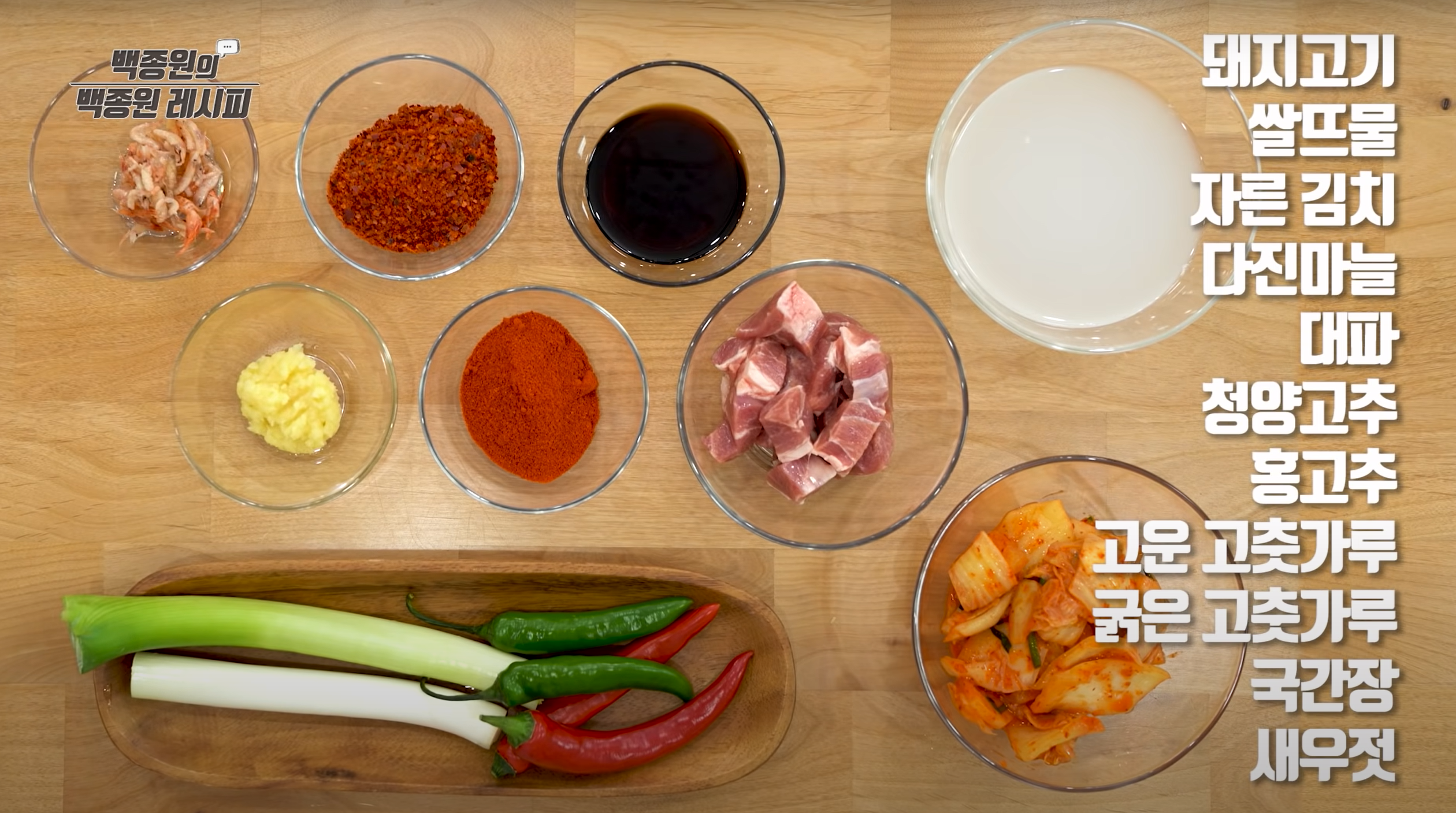 돼지고기 120g, 쌀뜨물 380ml (약 2컵), 자른 김치 150g, 다진마늘 30g (2큰술), 대파 30g, 청양고추 10g, 홍고추 10g, 고운 고춧가루 30g (2큰술), 굵은 고춧가루 30g (2큰술), 국간장 15ml (1큰술), 새우젓 15g (1큰술)