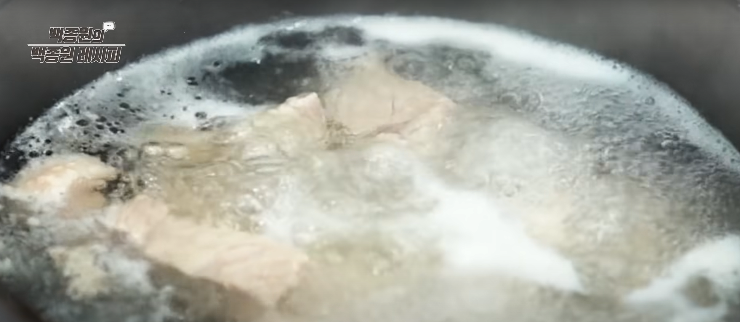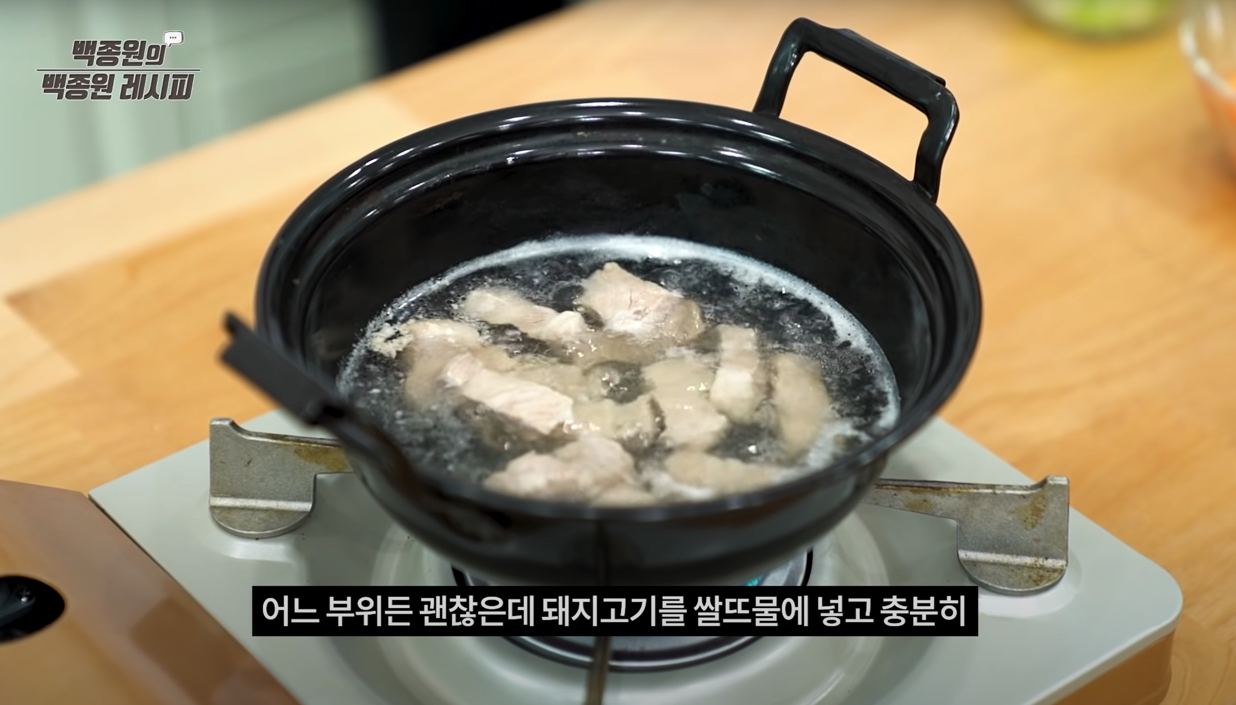 2. 냄비에 목살과 쌀뜨물을 넣고 충분히 끓여, 고기 육수를 우려냅니다. 고기에는 비계가 어느 정도 있는 것이 좋은데요, 평소 비계를 잘 안드시는 편이라면 국물 낼 때 만이라도 사용해보세요. 국물이 어느 정도 우러나고 나서 꺼내면 된답니다.