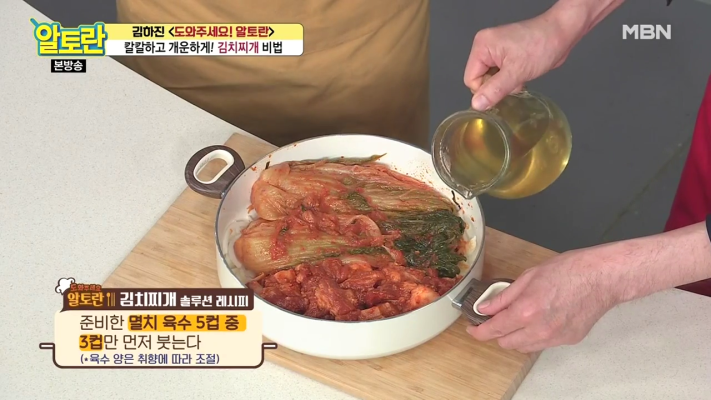 16. 김치찌개는 멸치육수가 빠지면 맛이 없다고 합니다. 멸치 육수 5컵을 준비해 주시고, 3컵만 먼저 부어주세요. (*육수 양은 취향에 따라 조절)