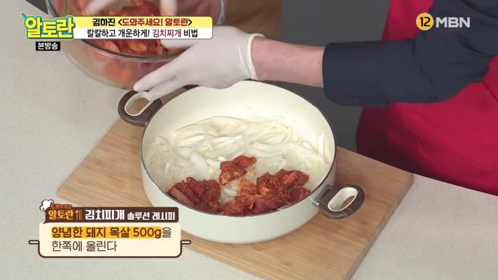 3. 채 썬 양파 200g을 냄비 바닥에 깔고 양념한 돼지 목살 500g, 양념한 통배추김치 1kg, 멸치 육수 3컵을 넣는다. (*육수 양은 취향에 따라 조절)
