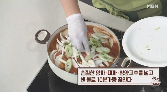 6. 손질한 양파, 대파, 청양고추까지 모두 넣어 주시구요, 뚜껑을 연 상태로 센 불로 10분가량 끓입니다.