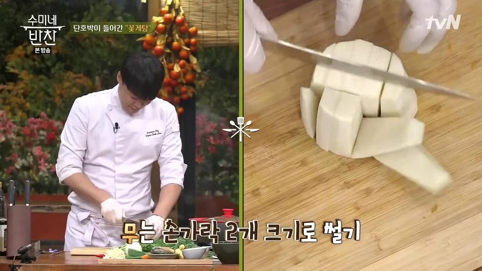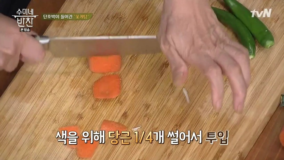 참고로 단호박은 전자레인지에 넣고 5분 정도 돌리거나, 뜨거운물에 3분 정도 미리 익히면 훨씬 쉽게 썰어져요. 또한 단호박 껍질은 듬성듬성 남아있도록 깎아야 나중에 익었을 때 보기 좋다고 하시네요.