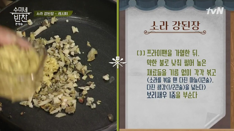 ⑥ 소라를 볶을 때는 비린내가 날 수 있어 다진 마늘 1큰술, 다진 생강 1/2큰술을 넣고 같이 볶아아요. 참고로 보리새우는 볶지 않는다고 하네요.