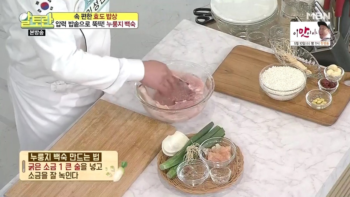 17. 1차적으로 닭백숙 황금레시피 압력솥 만드는 법이 완성되는데요, 닭은 식으면 질겨지기 때문에 먼저 드시고, 이후 누룽지를 먹는 것이 좋다고 해요.