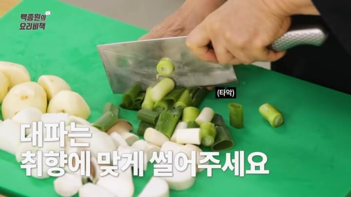 대파는 취향에 따라 좋아하면 크게 썰어도 되고, 싫어하면 송송 썰어도 된다네요. 고추는 고명으로 올릴 경우 어슷 썰기로 모양을 내주시면 좋아요.