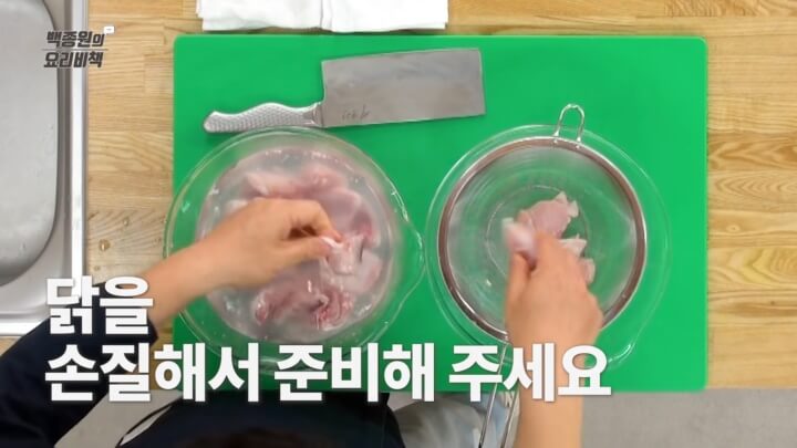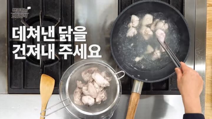 닭 사이에 내장을 잘 제거해서 깔끔하게 먹을 수 있도록 씻어주는데요, 냉동닭을 구매하면 특히 내장에서 냄새가 날 수가 있으니 흐르는 물에 뼈가 잘 나오게 씻어 주는 게 좋아요. 또한 잡내를 확실히 없애기 위해 한 번 데쳐주면 더욱 좋습니다.