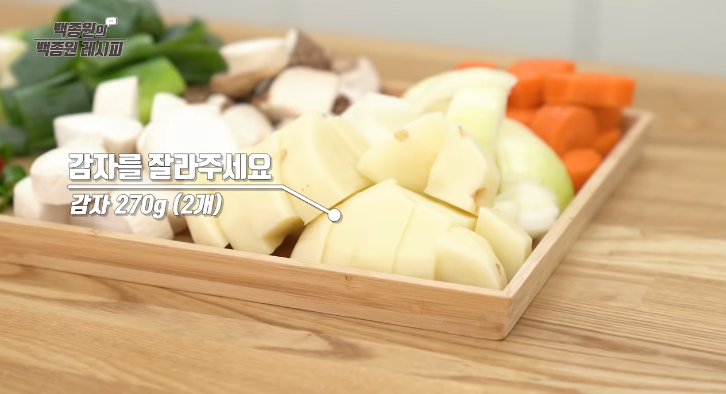 감자는 가능하면 큼직하게 써는 게 좋다고 하는데요, 이유는 물에 끓이면서 부서지기 때문입니다. 반면 당근은 더 작게 썰어 주세요.