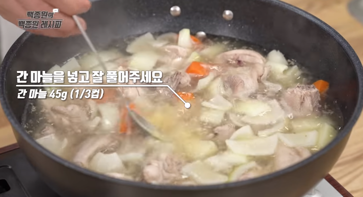 8. 채소가 반 정도 익으면 간 마늘 1/3컵을 넣습니다.
