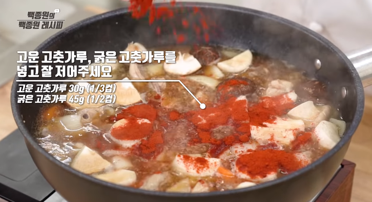 10. 고춧가루 1/2컵, 고운 고춧가루 1/3컵을 넣어 30~40분 정도 끓입니다.