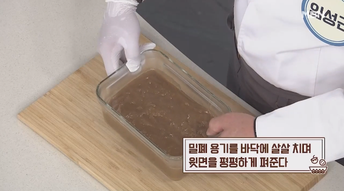 7. 밀폐 용기를 들었다 놨다 하면서 바닥에 4~5번 살살쳐주시면 윗면이 평평하게 다져집니다.