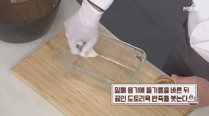 6. 밀폐 용기 하나를 꺼내 들기름을 바른 뒤 끓인 도토리묵 반죽을 부어주세요.