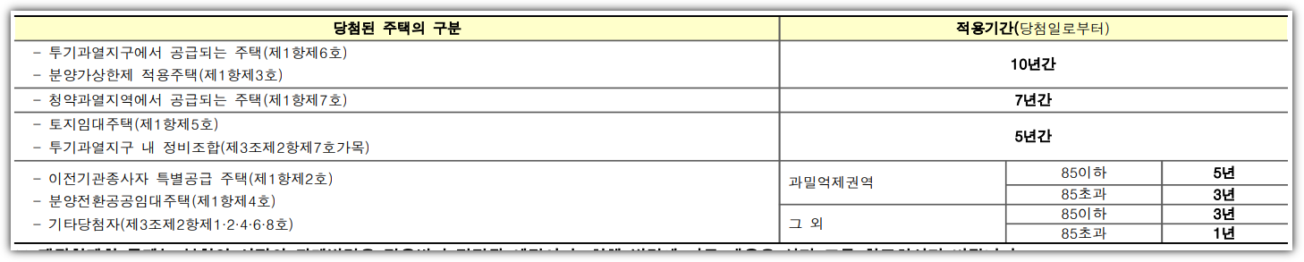 또한 동작구 수방사 분양은 본청약 당첨자 발표일을 기준으로 전매제한 및 재당첨제한이 산정되는데요, 구체적으로는 다음과 같습니다.
