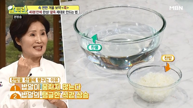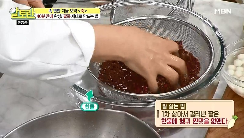 7. 동지 팥죽 만드는 법 오늘의 세 번째 포인트는 쌀이 아니라 찬밥을 넣어서 시간을 더욱 단축한다는 것인데요, 그냥 밥을 넣게되면 뭉치고 일일이 풀어줘야 하는 번거로움도 있기 때문에 바로 찬물에 헹군다는 것이 포인트!