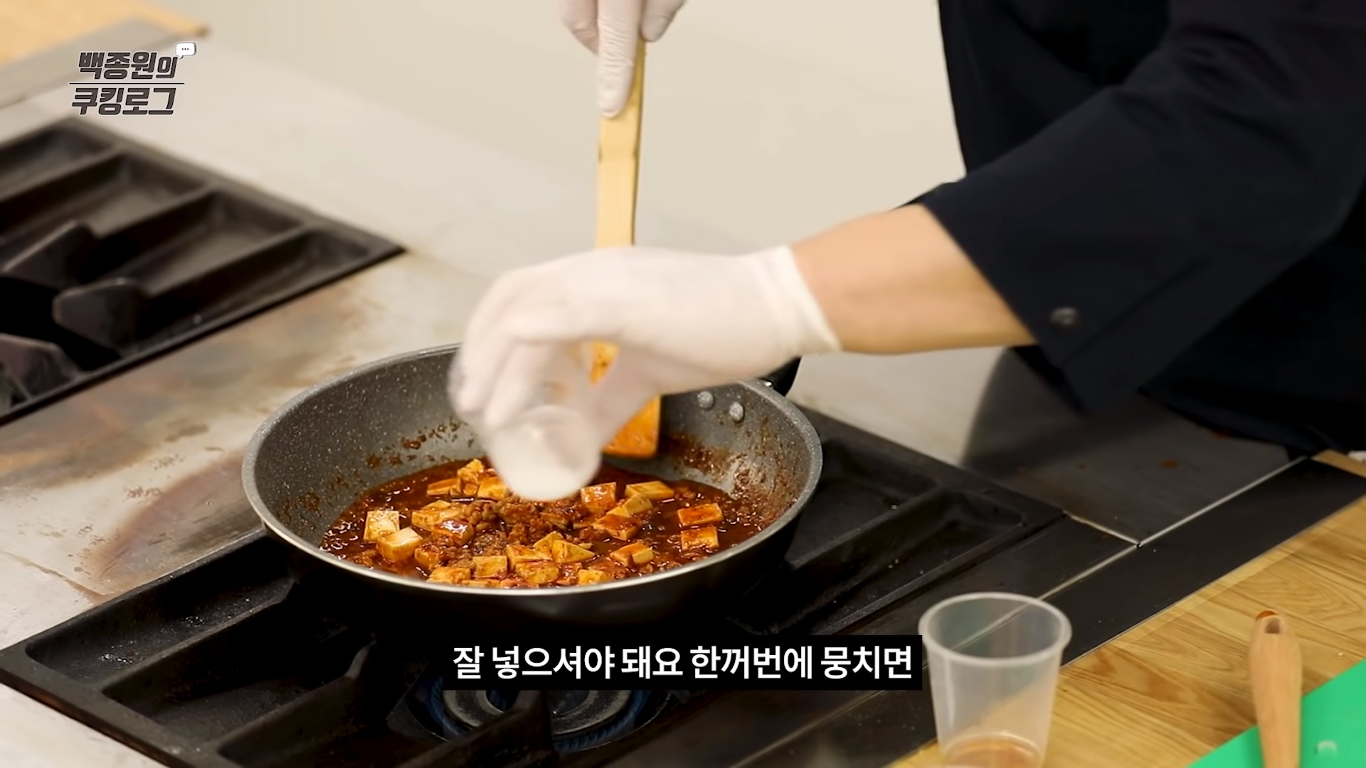 한꺼번에 넣으면 전분물이 뭉칠수도 있기 때문에 조금씩 넣어 주시는 것이 마파두부 만드는법 백종원 황금레시피의 포인트!