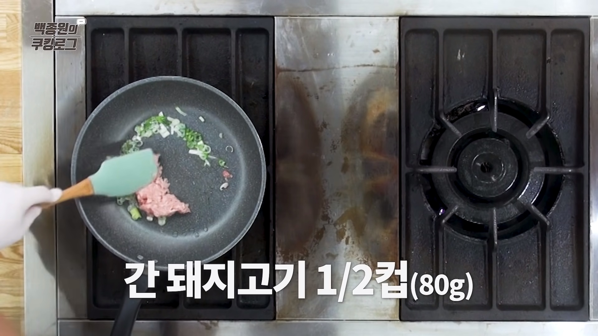 5. 파가 익기 시작하면서 고소한 냄새가 올라오면 돼지고기를 넣고 풀어가면서 볶아주세요.