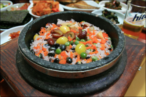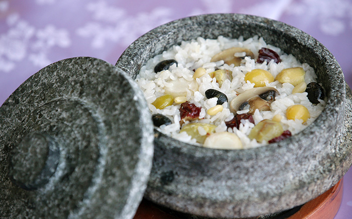 여섯 가지 이상의 천연 재료들을 우려낸 육수에, 밤, 대추, 콩, 당근 등을 넣어 돌솥에 지은 밥입니다. 함께 나오는 각종 나물과 간장 양념을 넣어 비벼 먹습니다. 영양돌솥밥은 밥과 나물, 육수가 한 그릇에 들어있어 균형 잡힌 식사를 할 수 있습니다.