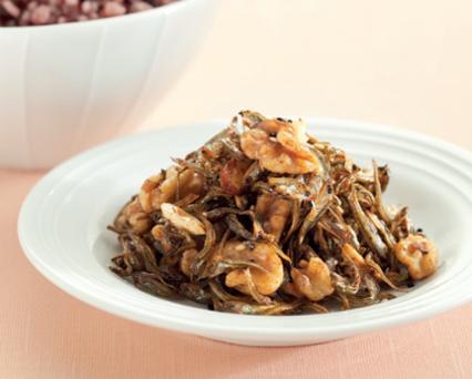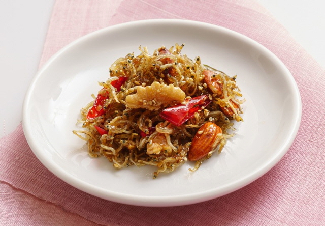 ※재료 : 잔멸치 100g, 편 썬 마늘 반 컵, 식용유 3 큰 술, 호두 반 컵, 땅콩 반 컵, 잣 1/3컵, 통깨 1 큰 술