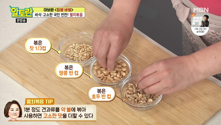 8. 볶은 잣 1/3컵, 볶은 땅콩 반 컵, 볶은 호두 반 컵 등 준비한 견과류도 마른팬에서 약 불에 1분 정도 볶아줍니다. 견과류가 멸치에 부족한 식이섬유를 보충해 주기 때문에 멸치볶음에 견과류를 넣으면 궁합이 좋다고 해요.