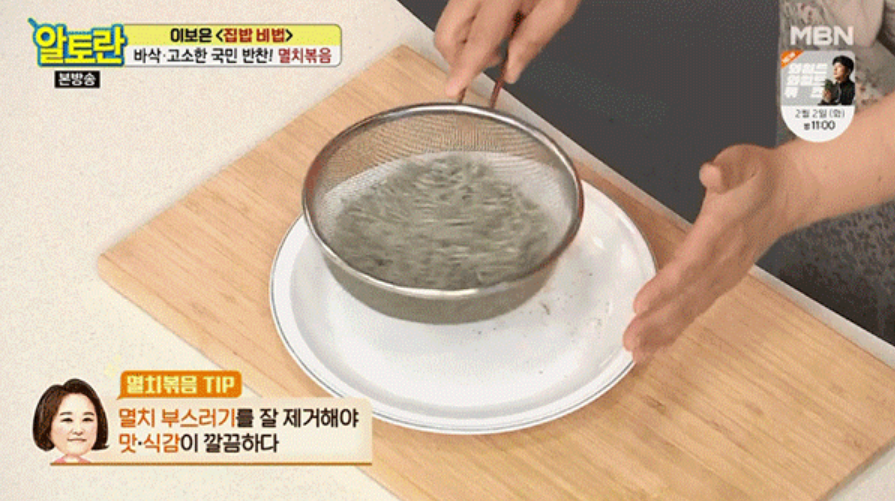 6. 멸치볶음 맛있게 만드는법 깔끔한 맛의 비법 중 하나는 체를 사용해 부스러기를 깔끔하게 털어주는 것입니다. 그래야 멸치가 훨씬 더 고소하고 잡내가 없어요.