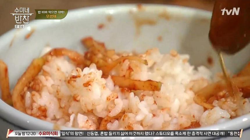 무생채를 갓 만들었는데 뜨끈뜨끈한 흰 밥을 빼놓을 수 없겠죠? 흰 쌀밥에 무생채를 적당히 올린 후 젓가락으로 섞어주고 참기름만 살짝 둘러 비벼 먹으면 아주 꿀맛이예요.