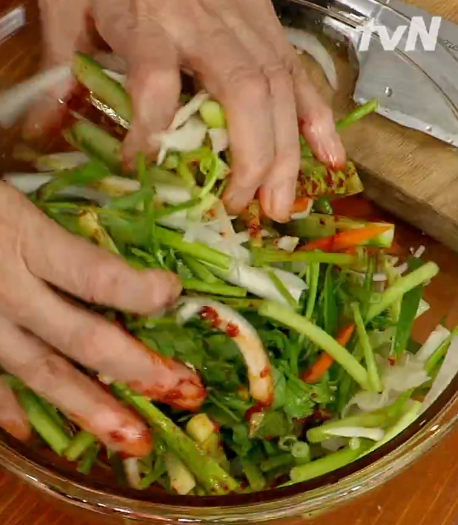 13. 그 다음 손질한 채소와 미나리를 한꺼번에 넣고 살살 버무려주세요. 이때 너무 힘을 주어서 버무리면 아삭한 식감이 떨어질 수 있기 때문에 되도록 살살 버무리셔야 해요.
