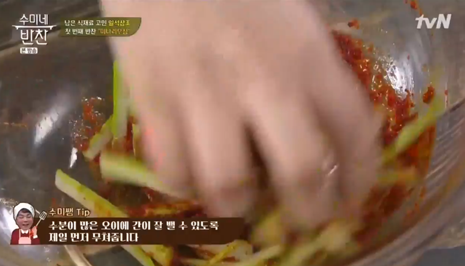 12. 간이 잘 밸 수 있도록 수분이 많은 오이를 제일 먼저 무쳐줍니다.