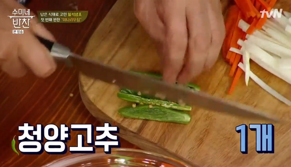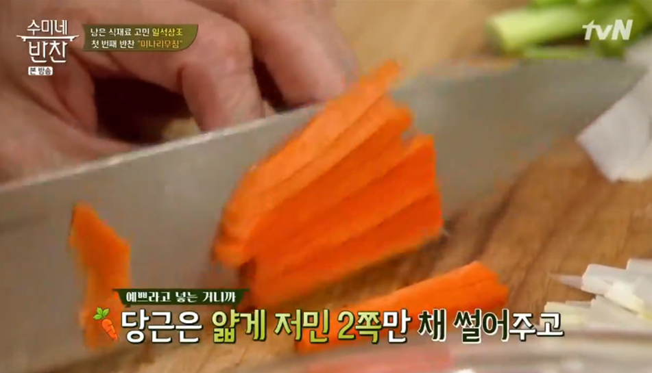 8. 당근은 얇게 저민 2쪽만 채썰어주세요.