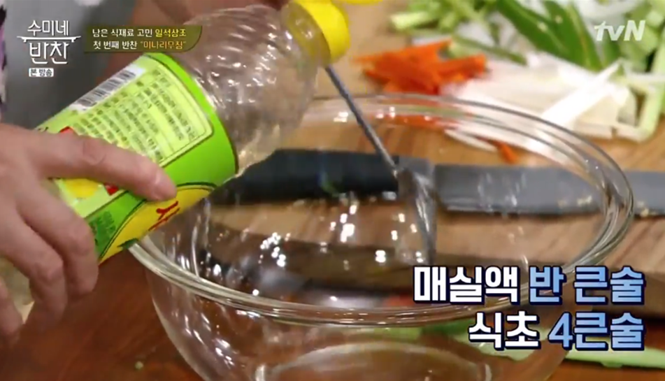 미나리무침 만드는 법 김수미 미나리무침 황금레시피의 핵심이라고도 볼 수 있는데요, 먼저 매실액 반 큰술과 식초 4큰술을 넣어 주세요.
