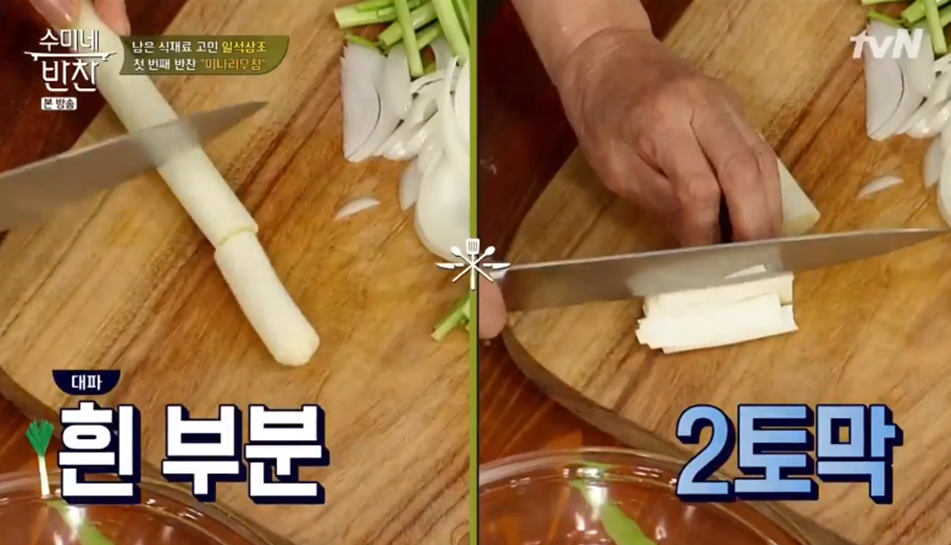 7. 대파 흰 부분을 토막 낸 후 채썰어주세요.