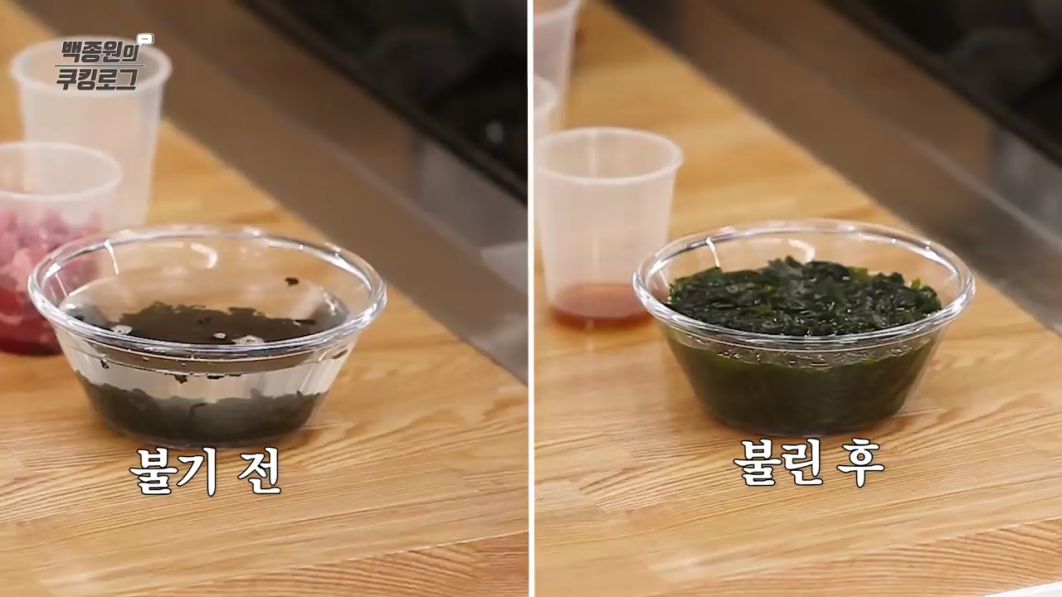 미역은 물에 불으면 양이 늘어나기 때문에 잘 모르겠다 싶으면 알려드린 정량만큼만 준비하시는 것이 좋을 것 같아요. 종이컵 반컵 정도라고 보시면 됩니다.