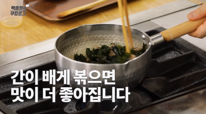 5. 볶아진 미역에 국간장을 넣어 간이 배게 볶고, 물을 넣어 끓입니다.