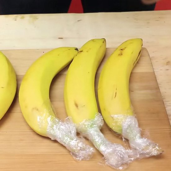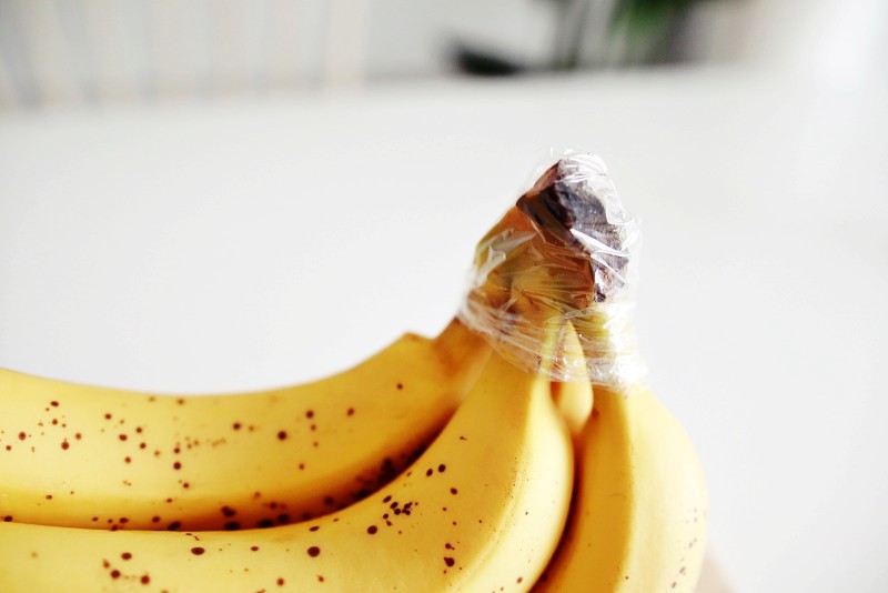 마트에서 바나나를 고를 때부터 비닐봉지에 포장된 바나나는 에틸렌 가스가 갇혀 있어 익는 속도가 빨라지기 때문에 고르지 않는 것이 좋습니다. 바나나를 구매한 후에는 꼭지를 랩으로 감싸면 에틸렌 가스 방출을 줄일 수 있는데요, 이와 더불어 에틸렌 가스를 방출하는 사과와 아보카도와 같은 과일과는 같이 두지 않는 것이 좋습니다.