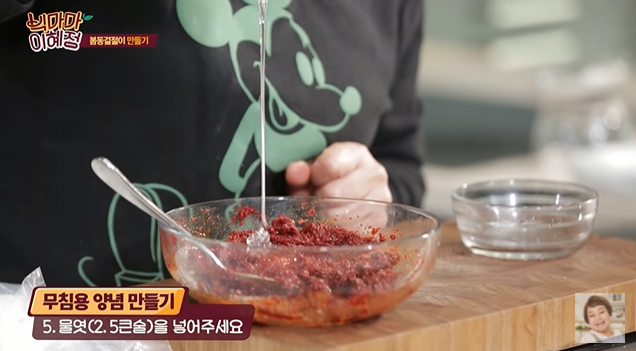 2. 미지근한 물 7~8큰술을 넣고 고춧가루와 섞어주는데 이때 고춧가루에 뜨겁거나 차가운 물을 넣으면 색이 예쁘게 안나온다고 하니 온도에 주의해주세요.