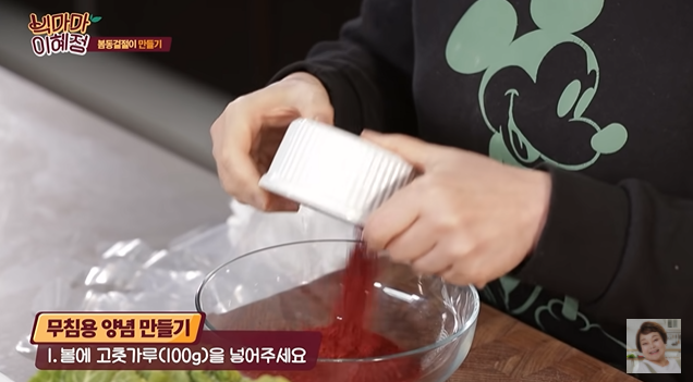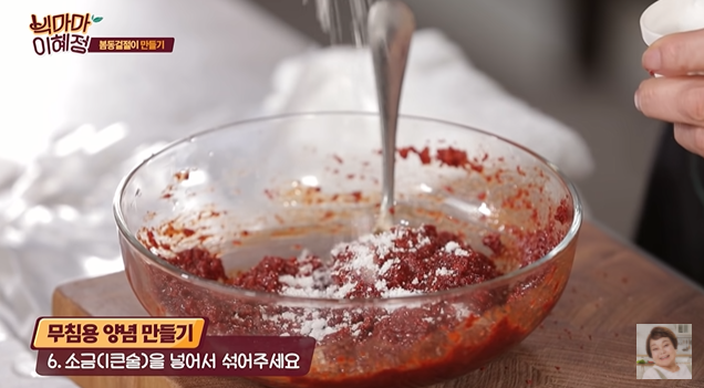 무침용 양념재료 : 고춧가루 100g, 미지근한 물 7~8큰술, 멸치액젓 6큰술, 설탕 1.5~2큰술, 물엿 2.5큰술, 소금 1큰술