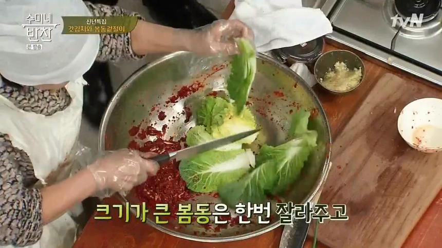 3. 크기가 큰 봄동은 한번 잘라주고 쪽파와 부추는 3등분 정도 잘라 아기 다루듯이 살살 버무려주세요.