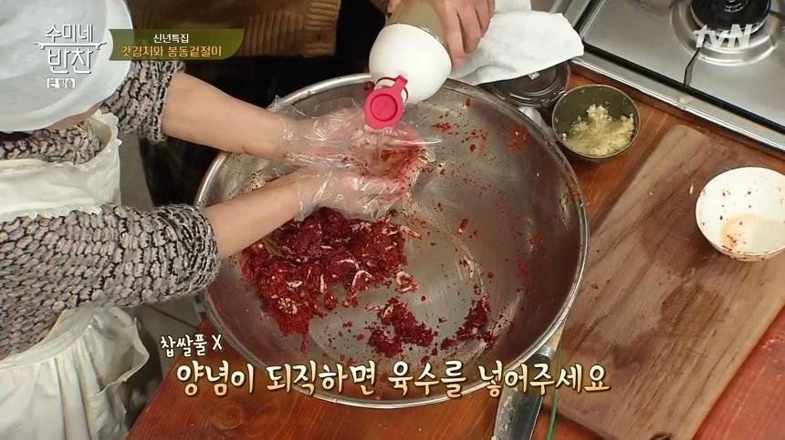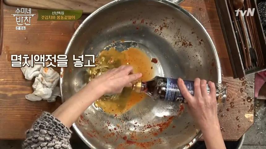 1. 봄동 겉절이 황금레시피 김수미 레시피입니다. 먼저 멸치액젓 3큰술, 육젓 1큰술, 다진마늘 크게 1큰술, 다진생강 반큰술, 고춧가루6큰술을 넣습니다. 봄동 겉절이 양념장은 그 다음 간을 보면서 조절합니다. 참고로 찹쌀풀은 넣지 않으며 양념이 되직하면 김장 때 만든 육수를 넣어주면 된다고 하네요.