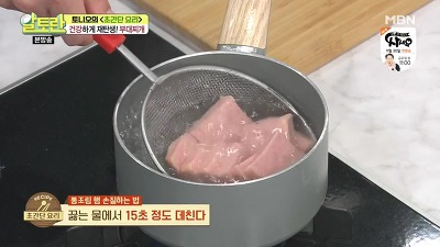 2. 꺼낸 햄은 약 1cm 두께로 썰어 준 뒤 끓는 물에서 15초 정도 데쳐 주세요. 데친 햄은 채반에 밭쳐 두어 물기를 제거합니다.