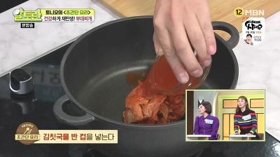 5. 냄비에 잘 익은 김치 1컵과 김칫국물 반 컵을 넣습니다.